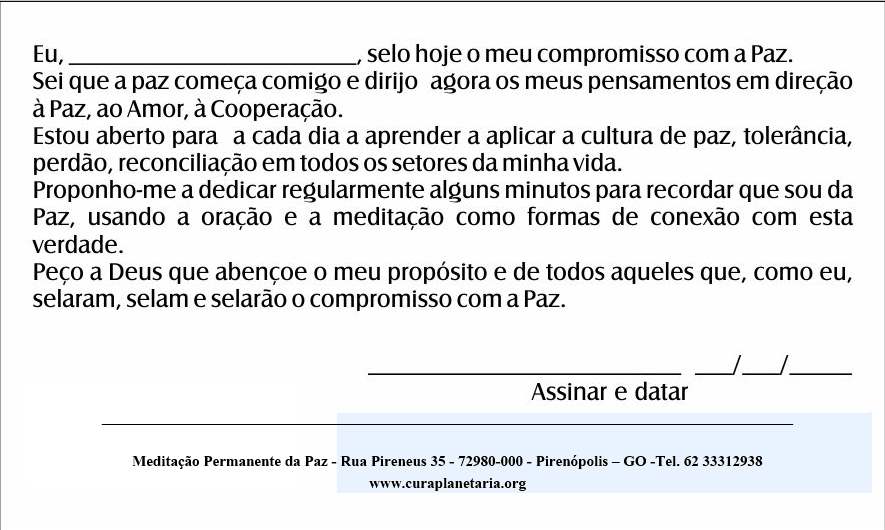 PEÇA AQUI SEU CARTÃO envie email para: contato@curaplanetaria.org Assunto : CARTÃO DA PAZ NOME: ENDEREÇO: CIDADE - ESTADO - CEP: Horário e local de sua meditação pela paz Cura Planetária e o Movimento de Meditação Permanente da Paz não vai compartilhar ou vender a sua informação pessoal. A nossa política é manter essa informação em sigilo.